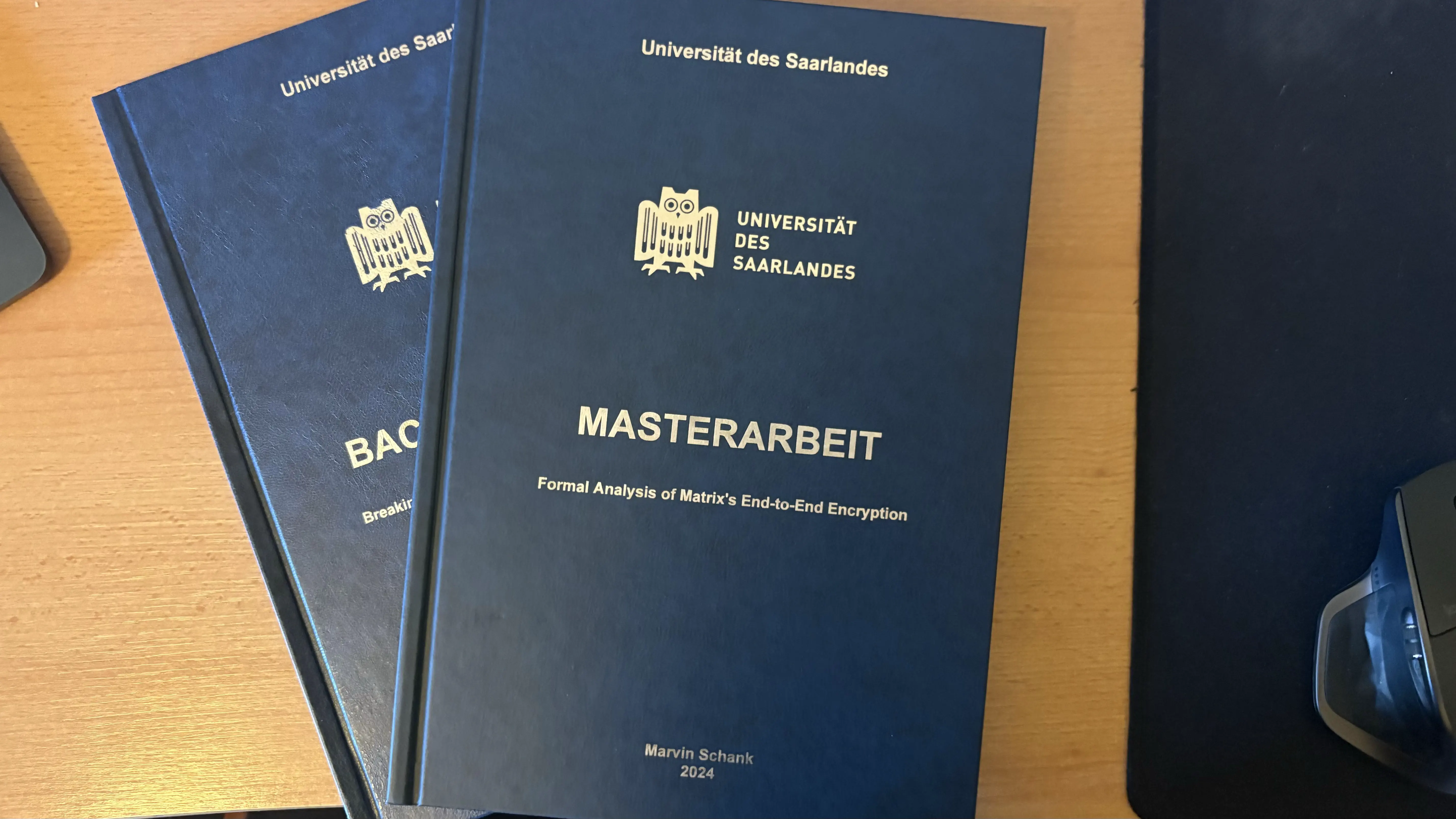 Die Informatikbibliothek 📚 der Universität des Saarlandes war bis zu meinem Master-Abschluss mein zweites Zuhause. Meine Masterarbeit handelt von Matrix, einer dezentralen Kommunikationsarchitektur, und dessen Verschlüsselungsprotokoll (Olm/Megolm). Dieses Protokoll habe ich mit Tamarin, einem Tool zur Protokollverifizierung, untersucht.
