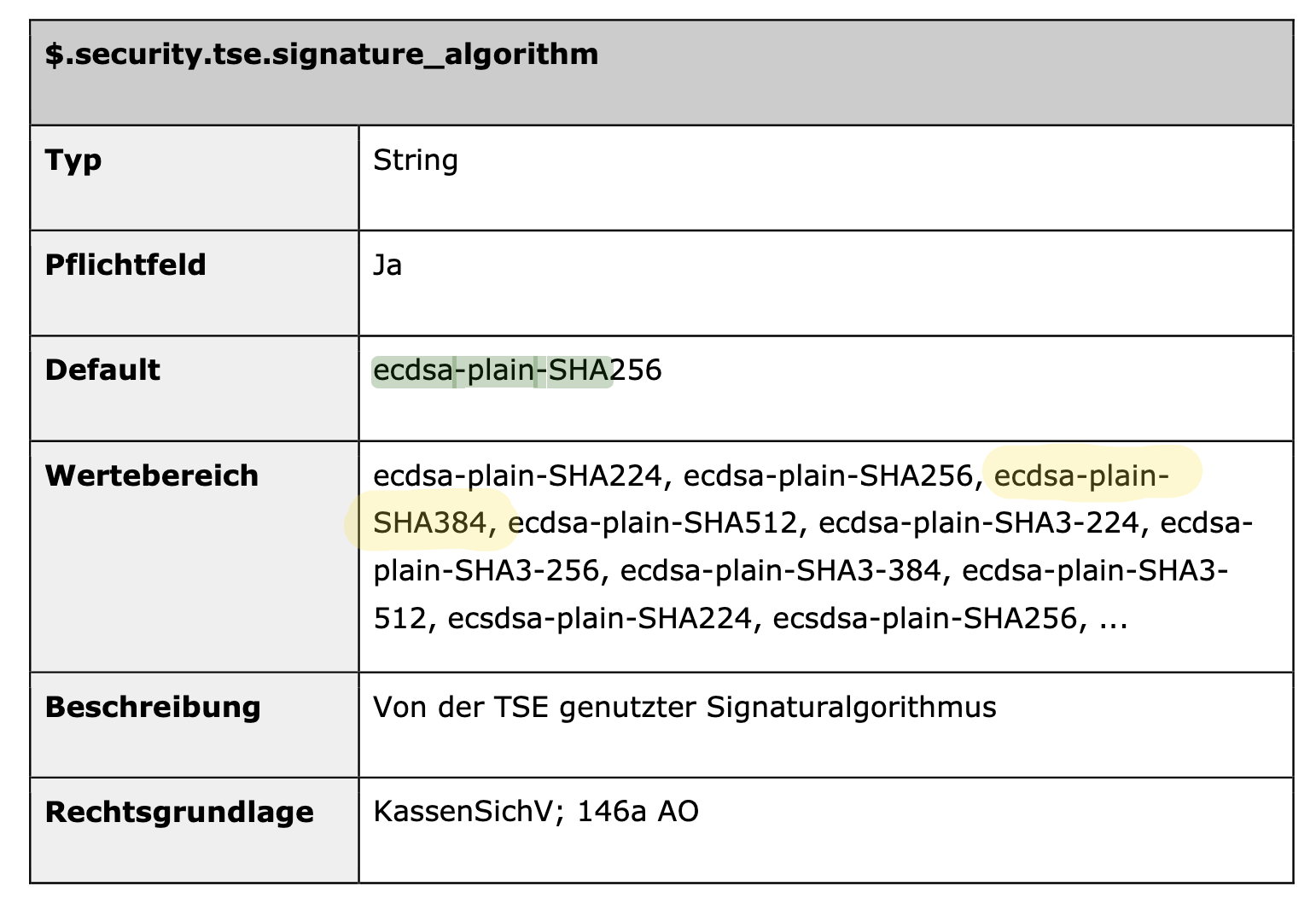 Der Standard definiert, dass Kassenbelege eine JSON-Struktur haben müssen, also eine simple Zuordnung von einem “Key” (hier “Hashalgorithmus”) zu einem “Value” (hier “ecdsa-plain-SHA384”). Im Kapitel “3.5 Sicherungsdaten (security)” erfährt man dann, dass “Hashalgorithmus” ein Pflichtfeld ist und standardmäßig “ecdsa-plain-SHA256” ist. Soso; Meine Sauna weicht also vom Default ab. Warum? Ich werde es wohl nie erfahren 🤷🏽♂️. Immerhin ist “ecdsa-plain-SHA384” ein erlaubter Wert: