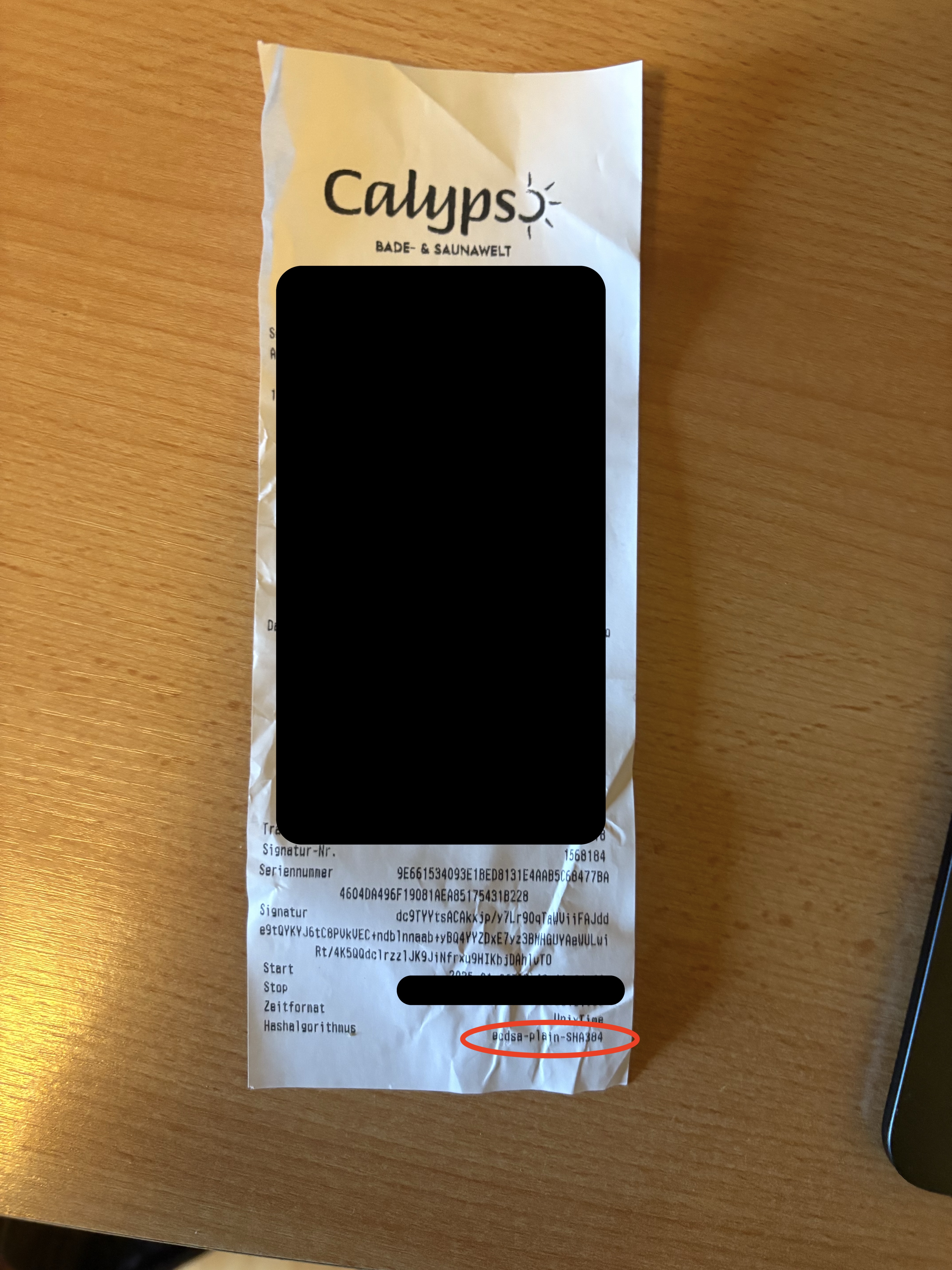 Vor nicht allzu langer Zeit war ich in der Sauna. Einen ganzen Tag lang legte ich die Füße hoch, las in einem Buch, heizte mich auf und genoss den Tag. Als es dann Zeit wurde zu gehen, fragte der Kassierer, ob ich den Beleg brauche. Ich weiß nicht, was ihr in dieser Situation sagt, aber bei mir ist das immer eine 50/50-Entscheidung. Ich entschied mich an jenem Tag für “Ja.” Auf dem Kassenzettel las ich dann etwas von “ecdsa-plain-SHA384”, was mein Kryptografie-Herz natürlich höher schlagen ließ.