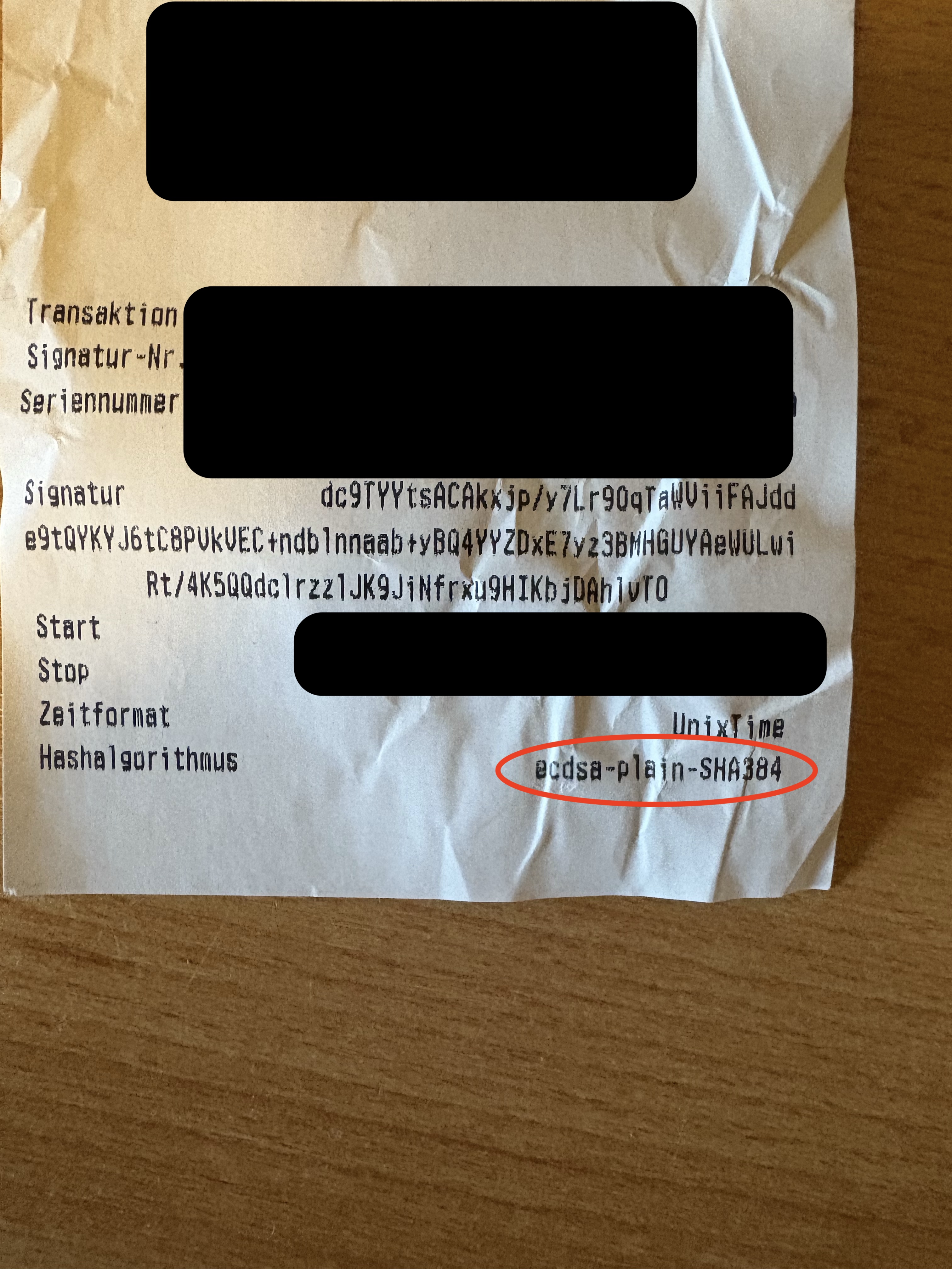 Sucht man im Internet nach “ecdsa-plain-SHA384”, so landet man beim “Elektronische(n) Kassenbeleg Standard.” Klar, wie konnte ich so naiv sein zu glauben, in Deutschland gäbe es keine Norm dafür😅🙄; Mein Fehler. Was steht denn da drin?