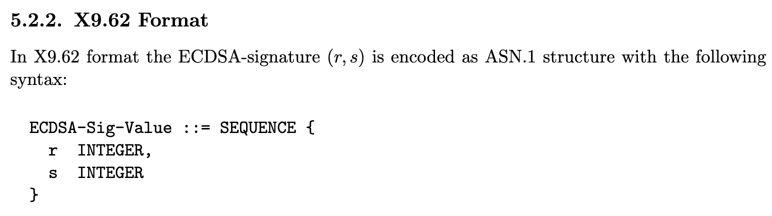 Nutzt man elliptische Kurven zum Signieren, besteht eine Signatur immer aus zwei Teilen: $(r, s)$. “plain” deutet schlicht an, wie diese zwei Teile formatiert sind, in diesem Fall, einfach “plain” hintereinander geschrieben: $r||s$. Da der Computer weiß, wie lang die Werte sind, weiß er automatisch, wann $r$ aufhört und $s$ beginnt. Neben “plain” gibt es noch andere Formate, um $(r, s)$ mitzuteilen, z.B. das “X9.62” Format: